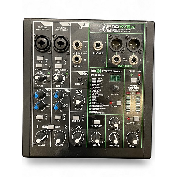 Used Mackie ProFX6v3 Unpowered Mixer in great condition, offering 2 Onyx mic preamps with 60dB gain, 2-band EQ, GigFX effects engine with 24 effects, USB interface for 2x4 recording, and 48V phantom power support. Compact and reliable, it's perfect for live sound, recording, or streaming. This 6-channel mixer delivers professional performance in a portable design, ideal for musicians, podcasters, and creators seeking high-quality sound with flexible connectivity and real-time effects processing.