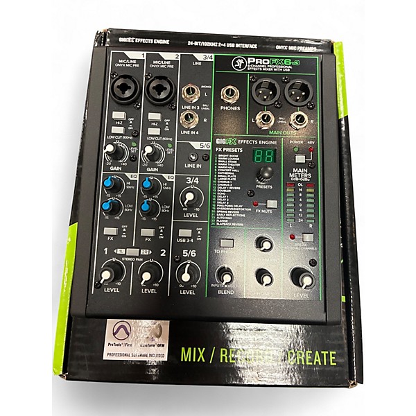 Used Mackie ProFx6 Powered Mixer in excellent condition, perfect for small gigs, recording, or podcasting. This compact 6-channel mixer features 2 low-noise Mackie preamps, 3-band EQ, built-in RMFX effects engine with 16 effects, and USB connectivity for easy recording and playback. Ruggedly built with intuitive controls, it offers professional sound quality in a portable design. Ideal for musicians and audio professionals seeking reliable performance and versatility in a compact form factor.