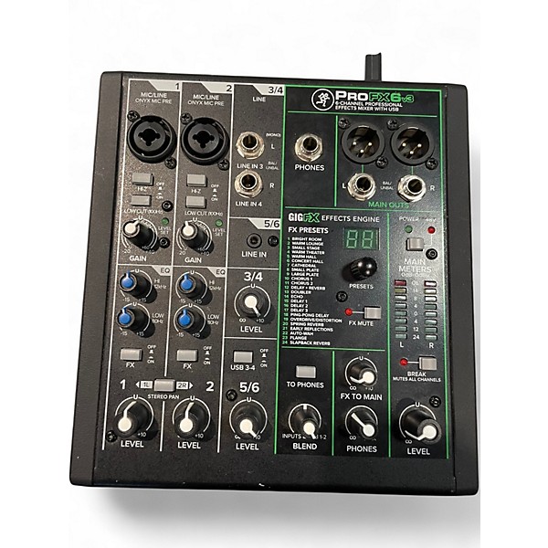 Used Mackie ProFX6 Powered Mixer in good condition, offering 2 mic/line channels with Onyx mic preamps, 16 built-in digital effects, 3-band EQ, and USB connectivity for easy recording or playback. Compact and reliable, it’s ideal for solo performers, small bands, or podcasting setups. This 6-channel mixer includes stereo RCA inputs and a headphone output, providing versatile control in a portable design without sacrificing professional sound quality.