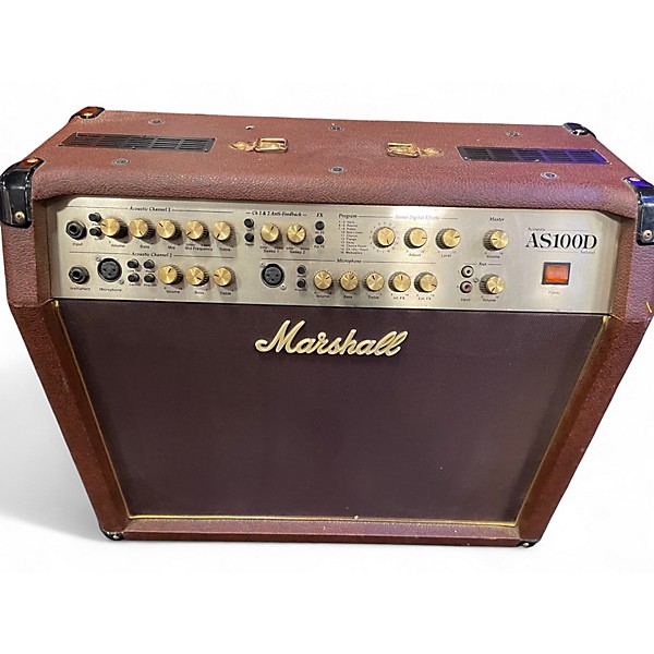Capture the rich, natural tone of your acoustic guitar with this used Marshall AS100D Acoustic Combo Amp in Good condition. Offering 100 watts of power through two 8" speakers and a high-fidelity tweeter, it delivers clear, dynamic sound. Features include four channels, digital effects, anti-feedback controls, and XLR inputs—perfect for solo performers or duos. Designed for room-filling sound and versatile gigging, this amp is a reliable choice for acoustic players seeking professional performance.