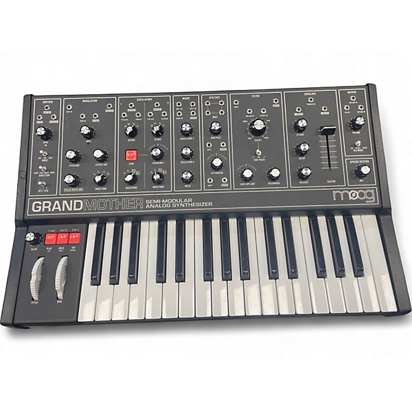 Used Moog Grandmother Dark in great condition, fully functional and lightly used. This semi-modular analog synthesizer features 2 oscillators, classic Moog ladder filter, spring reverb, and a built-in arpeggiator and sequencer. Patchable with 41 patch points for endless sound design possibilities, it requires no patching to play. Ideal for vintage analog tones with modern versatility, this unit delivers the rich, warm sound Moog is known for in a sleek all-black design.