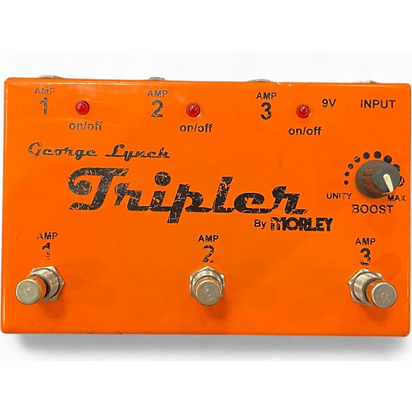 Used Morley George Lynch Tripler Boost Effect Pedal in fair condition. This versatile pedal lets you route your guitar signal to three separate amps with individual on/off switches and a master boost control. Passive design with a powered gain circuit for the boost function. Ideal for players wanting massive tonal options on stage. Shows cosmetic wear but functions properly. Requires a 9V battery or optional 9V power supply for boost operation.