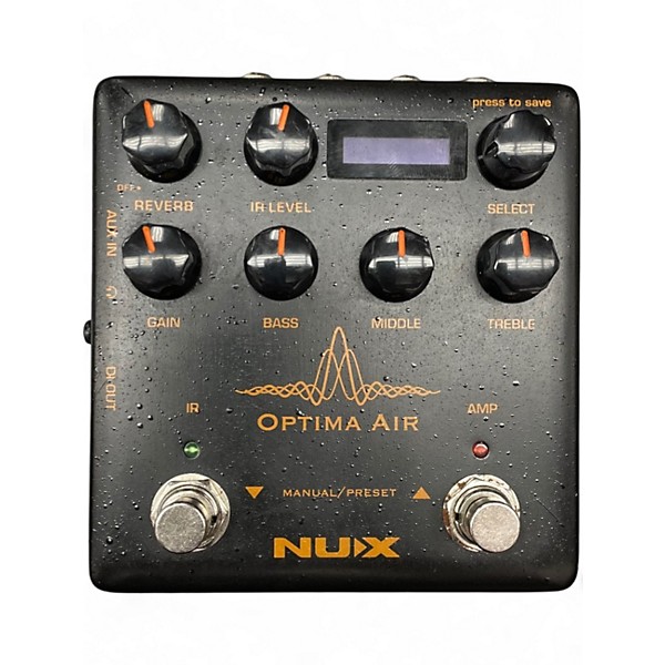 Used NUX Optima Air Effect Pedal in good condition, offering premium acoustic guitar tone modeling and IR loader capabilities. Features include 3-band EQ, built-in reverb, preamp simulation, and 24-bit audio quality. Ideal for enhancing live performance or studio recordings with realistic acoustic tones, it supports USB connectivity for IR file management. Compact and rugged, this pedal is perfect for musicians seeking flexibility and natural acoustic sound in a reliable, pedalboard-friendly format.
