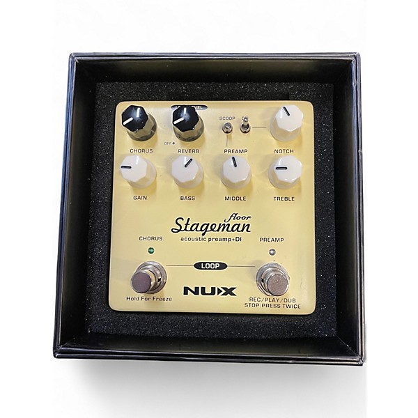 Used NUX STAGEMAN Guitar Preamp in great condition, perfect for acoustic players seeking rich tone and portability. Features include a 3-band EQ, built-in chorus and reverb effects, and a balanced XLR output for direct connection to mixers or PAs. With its intuitive controls and warm, natural sound, the STAGEMAN enhances live performances or studio sessions. Compact and reliable, it’s ideal for musicians who need clean preamp tone with simple onboard effects.