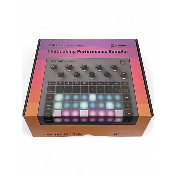 Used Novation Circuit Rhythm Production Controller in great condition—an inspiring, hands-on sampler and beat machine for studio or stage. Capture and slice samples, build patterns fast with 8 sample tracks, and perform with responsive RGB pads and tactile controls. Includes onboard sequencing, real-time effects, and a built-in rechargeable battery for portable sessions. Connect easily via MIDI In/Out/Thru, stereo audio I/O, and USB for flexible integration with your setup.