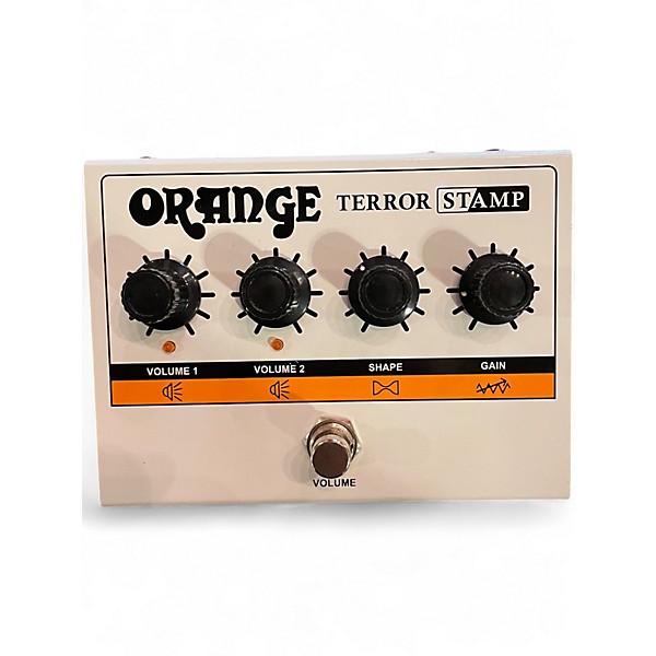 The Used Orange Terror Stamp is a compact, pedal-sized guitar amp head delivering 20 watts of hybrid power. Featuring a tube preamp (ECC83/12AX7) and solid-state output, it offers classic Orange tone in a portable format. It includes Volume, Shape, and Gain controls, a Buffered FX Loop, and a CabSim headphone output for silent practice or recording. In great condition, this powerful little amp is perfect for gigging guitarists seeking versatility and legendary Orange tone.