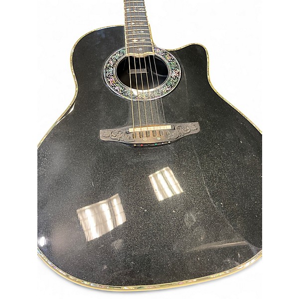 Used Ovation Custom Legend Acoustic Electric Guitar in Metallic Silver, featuring a deep contour Lyrachord body, solid spruce top, and deluxe abalone inlays. The onboard OP-Pro preamp system offers powerful sound control for both stage and studio use. This guitar is in good condition with light wear, and it delivers rich tones with excellent projection. Its ergonomic design and unique finish make it a striking, reliable choice for discerning players.