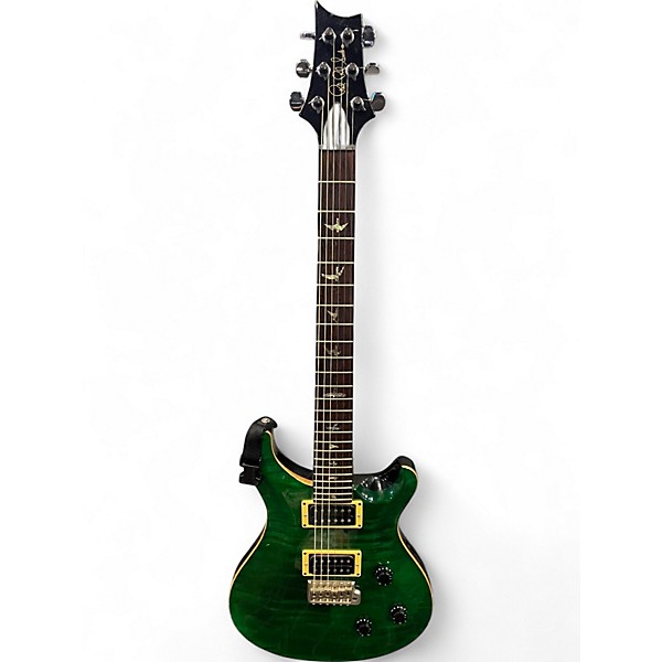 Celebrate tone and craftsmanship with this used PRS 20th Anniversary Custom 24 in striking Emerald Green. Featuring a carved maple top, mahogany body, 25" scale length, rosewood fretboard with 24 frets, and the iconic bird inlays, this solid body electric guitar delivers exceptional playability. Outfitted with PRS humbuckers and a 5-way selector switch, it's perfect for versatile, high-performance sound. In great condition, it's a collector-worthy piece ready to inspire your next performance.