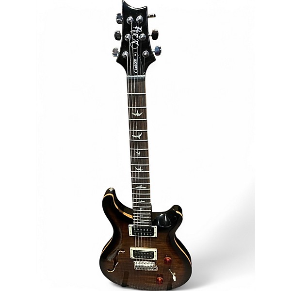 This used PRS SE Custom 24 in striking Black Gold finish is in excellent condition and ready to inspire. Featuring a mahogany body with a maple top and stunning flame maple veneer, it offers a sleek, comfortable double-cutaway design. The maple neck with a rosewood fretboard includes 24 frets and PRS’s signature bird inlays, delivering smooth playability. Equipped with dual 85/15 “S” humbuckers and a 3-way blade switch with coil-splitting push/pull tone control, this guitar delivers a versatile range of tones from warm cleans to aggressive crunch. The PRS patented molded tremolo bridge and PRS-designed tuners provide stable tuning and expressive dynamics. Whether you're a performer or a collector, this SE Custom 24 blends refined aesthetics with excellent performance, making it a standout addition to any lineup.