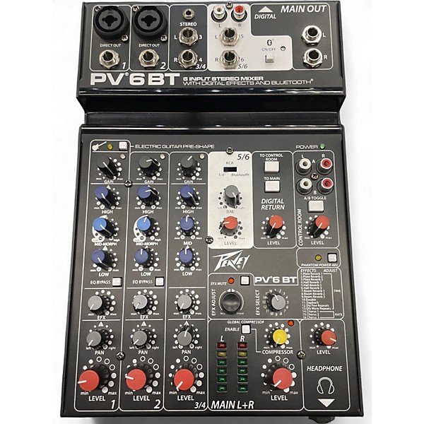 Used Peavey PV-6BT unpowered mixer in good condition, ideal for small gigs, rehearsals, streaming, and PA setups. This compact 6-channel analog mixer features built-in Bluetooth for wireless audio playback, XLR mic inputs with quality preamps, stereo line channels for instruments or media sources, 2-band EQ per channel for quick tone shaping, and a main stereo output for easy connection to powered speakers or an amplifier. Rugged and reliable Peavey performance.