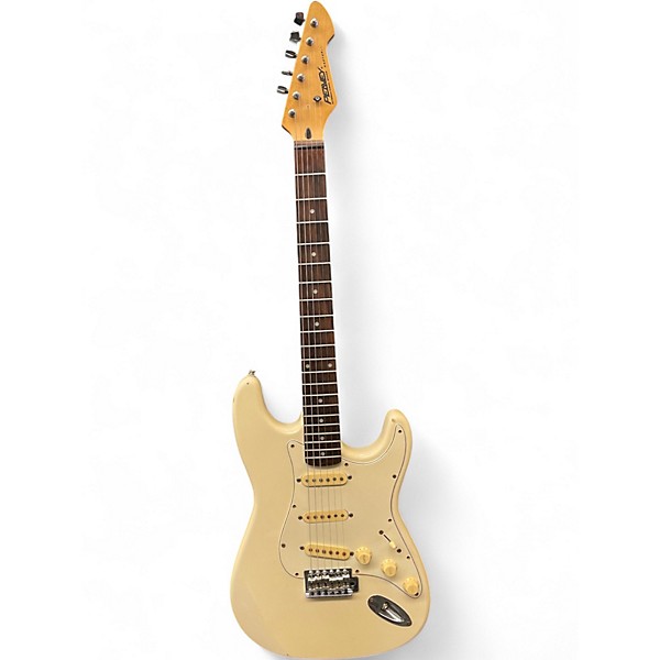 Used Peavey RAPTOR Cream Solid Body Electric Guitar in fair condition features a contoured body, bolt-on maple neck, rosewood fingerboard, and three single-coil pickups for versatile tone. With a 5-way selector switch and vintage-style tremolo bridge, it's an ideal choice for beginner to intermediate players seeking classic styling and functionality. Visible signs of use, but fully playable and ready for its next stage performance or practice session.