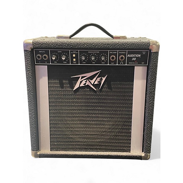 Used Peavey Audition 30 Guitar Combo Amp in fair condition, perfect for practice or small gigs. This solid-state amp delivers 30 watts of power through an 8-inch speaker, offering classic Peavey tone with simple controls for volume, gain, and EQ. It features inputs for high and low gain, along with headphone and external speaker jacks. Shows cosmetic wear but works reliably, making it a budget-friendly option for beginner guitarists or collectors.