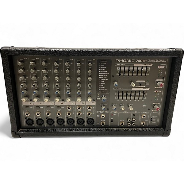 Used Phonic Powerpod 740 Plus Powered Mixer in good condition, offering 440 watts stereo power output and 800 watts bridged mono. Features 7 channels with 3-band EQ, built-in 32/40-bit digital effects processor, and dual 7-band graphic EQs. Ideal for small to medium live sound setups, this reliable mixer delivers clean sound and flexible control in a rugged, portable design. Perfect for bands, DJs, or venues seeking dependable audio performance.