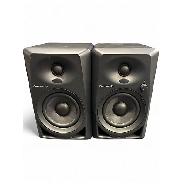 Used Pioneer DJ DM-40 powered monitors in good condition, delivering clear, punchy sound in a compact desktop design. Each speaker features a 4-inch woofer and 3/4-inch soft-dome tweeter with front-loaded bass reflex for tight low end, ideal for DJing, streaming, and home studio monitoring. Built-in amplification provides balanced volume and detail, with easy rear-panel controls and standard RCA/3.5mm connectivity for quick hookup to mixers, controllers, or computers.