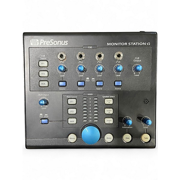 Used PreSonus Monitor Station signal processor in good condition—an essential desktop hub for accurate studio monitoring and control. Manage multiple source inputs and switch between speaker sets with level control, plus talkback and headphone monitoring for sessions. Designed for clear, reliable signal routing and convenient A/B comparisons, it’s ideal for project studios and mix rooms needing hands-on monitor management without clutter. Clean operation with normal cosmetic wear from use.
