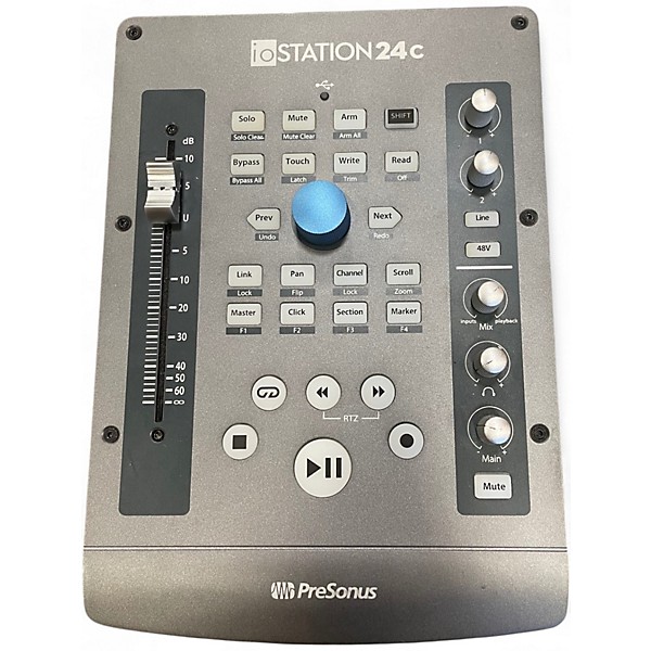 Used PreSonus ioStation 24c in great condition, combining a 24-bit/192 kHz USB-C audio interface with hands-on DAW control. Capture pristine vocals and instruments with one XMAX-L mic preamp, plus 2 inputs and 2 balanced outputs for flexible routing. A 100 mm motorized fader, transport controls, and assignable buttons speed up mixing and automation, while onboard headphone monitoring keeps sessions tight and accurate.