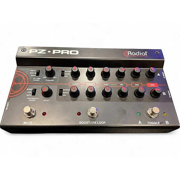 Used Radial Engineering PZ-Pro footswitch in great condition, offering premium signal control for acoustic instruments. This 2-channel preamp features powerful EQ, notch filter, boost, effects loops, and a balanced DI output. Ideal for live performance, it supports both piezo and magnetic pickups with individual input trims and phase reversal. Rugged build and intuitive layout make it a reliable tool for professional musicians seeking flexible tone shaping and stage-ready connectivity.