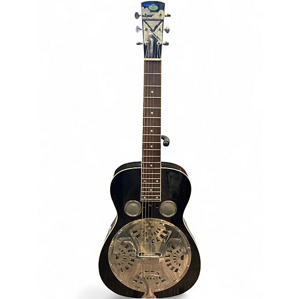 Used Regal RESONATOR Black Resonator Guitar in Good condition, featuring a striking gloss black finish and a classic spun aluminum resonator cone for that distinctive metallic tone. Its round neck design and 12-fret body join make it ideal for blues and slide guitar enthusiasts. This model includes traditional f-holes, a biscuit bridge, and chrome hardware. With solid playability and rich resonance, it’s a dependable instrument for players seeking vintage-style acoustic performance.