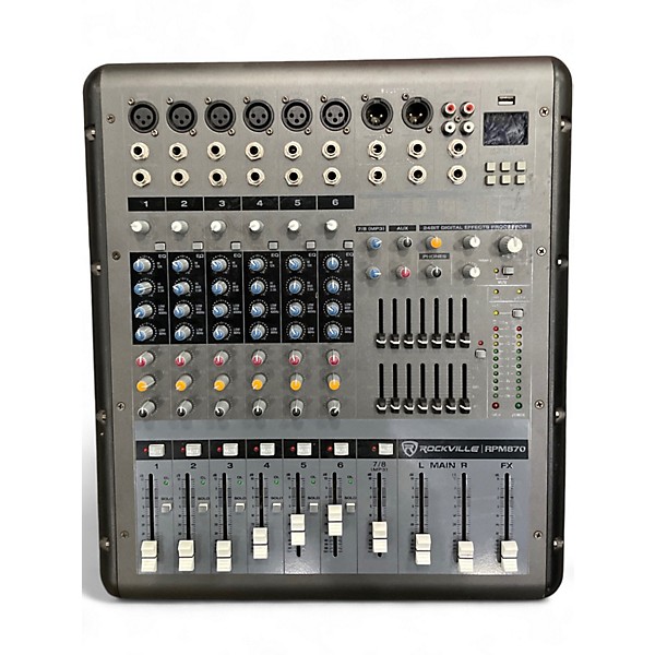 Used Rockville RPM870 Powered Mixer in good condition, ideal for small to mid-size live sound setups. This powered mixer delivers reliable amplification with multiple mic/line inputs and built-in mixing controls for quick, all-in-one operation. Designed for straightforward setup and solid performance, it’s a great choice for bands, DJs, rehearsal spaces, and venues needing a compact PA solution. Cleanly maintained with normal cosmetic wear from use, fully ready to put to work.