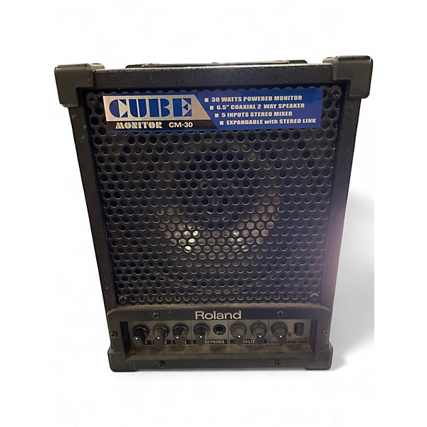 Used Roland CM-30 30W Keyboard Amp in good condition, ideal for keys, electronic drums, vocals, and small PA needs. This compact cube delivers 30 watts through a 6.5-inch speaker, with a 3-channel mixer featuring XLR and 1/4-inch inputs, plus stereo line inputs for keyboards and media players. Built-in EQ and line out support easy tone shaping and connection to larger systems. Great grab-and-go amp for rehearsals and gigs.