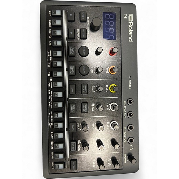 Used Roland T-8 Beat Machine in excellent condition—an ultra-portable AIRA Compact groovebox combining 303-style bass and punchy TR drum sounds for instant acid lines and tight rhythms. Create patterns fast with a hands-on sequencer, punch-in performance controls, and built-in effects for movement and grit. Features MIDI over USB-C for easy syncing, onboard rechargeable battery for mobile sessions, and a compact, rugged design that’s ready for studio or stage.