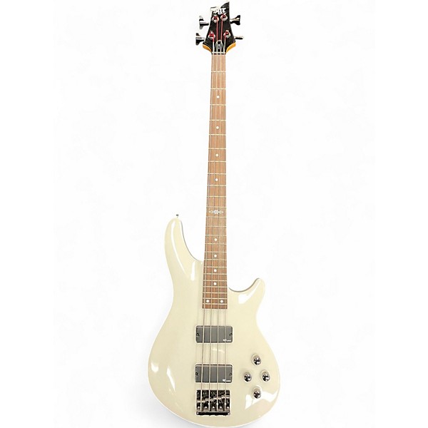 Used Schecter Guitar Research C4 White Electric Bass Guitar in good condition, featuring a sleek arched basswood body, bolt-on maple neck, and rosewood fingerboard. Equipped with dual active EMG-HZ humbuckers for powerful, punchy tone and a 24-fret neck for extended range. The 34" scale and custom inlays add both playability and style, making it a solid choice for rock, metal, or funk players seeking performance and reliability at a great value.