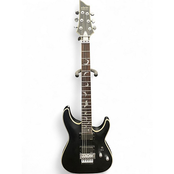 Used Schecter Guitar Research Damien Platinum 6 Floyd Rose in Flat Black, featuring a sleek mahogany body, maple neck, rosewood fingerboard with platinum bat inlays, and active EMG 81/85 pickups for powerful tone. Equipped with a Floyd Rose Special tremolo system for stable, expressive playing. This solid body electric guitar is in great condition, delivering aggressive sound and smooth playability for metal and hard rock players. 24 extra-jumbo frets and a thin "C" neck profile ensure fast action.