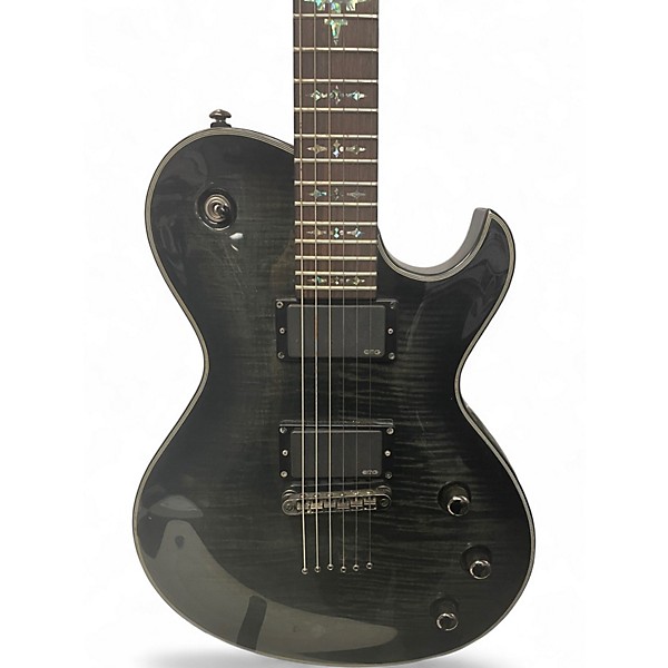 Unleash crushing tone and sleek style with this used Schecter Guitar Research Damien Solo Elite in Trans Black, in great condition. This solid-body electric features a fast set neck, 24 jumbo frets on a comfortable rosewood-style fingerboard, and high-output humbuckers for tight lows, searing leads, and rich sustain. The dramatic translucent black finish, dark hardware, and signature Damien aesthetics make it stage-ready, while the reliable fixed bridge keeps tuning stable for aggressive playing.