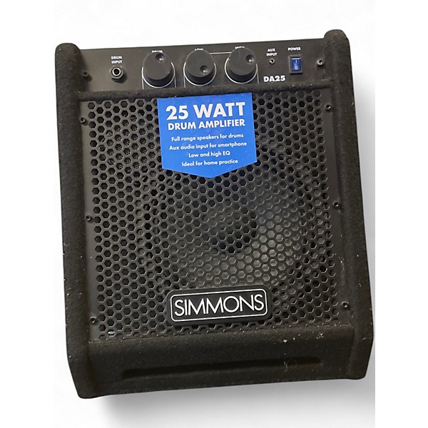 The Simmons DA25 Drum Amplifier delivers 25 watts of power through a rugged 6.5" speaker, ideal for personal practice or small performances. Designed specifically for electronic drums, it features a 2-band EQ, two 1/4" line inputs, and a headphone jack for private sessions. This used unit is in Good condition, offering reliable sound with responsive tone control in a compact, portable design—perfect for drummers seeking quality amplification without breaking the bank.