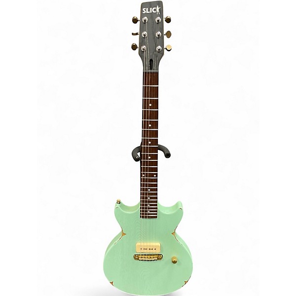 Turn heads with this Used Slick SL59 solid body electric guitar in Seafoam Green. In good condition, it delivers classic single-cut style, smooth playability, and punchy electric tone suited for blues, rock, and beyond. Features a solid body design, comfortable set-style neck feel, 6-string configuration, standard controls, and a fixed bridge for reliable tuning and sustain. A great choice for players wanting vintage vibe and modern dependability at a smart price.