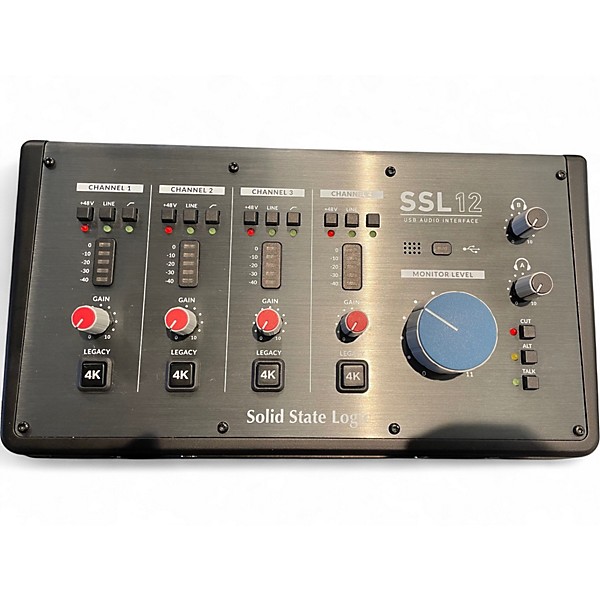 Used Solid State Logic SSL12 Audio Interface in great condition, offering 4 mic/line preamps, 2 Hi-Z inputs, and ADAT input for expanded I/O. Delivers pristine 32-bit/192kHz audio quality and features SSL's legacy 4K analog enhancement mode. USB-C connectivity ensures fast, reliable performance with low-latency monitoring, all in a compact desktop design. Ideal for professional and home studios seeking premium SSL sound with flexible routing and powerful software integration in a rugged, sleek interface.