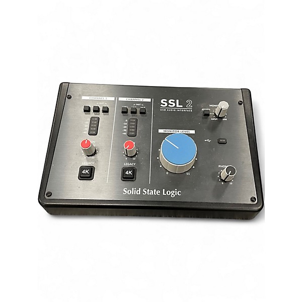 Used Solid State Logic SSL2 audio interface in excellent condition, delivering classic SSL sound in a compact 2-in/2-out USB-C design. Features two high-gain SSL mic preamps, 48V phantom power, switchable Legacy 4K analog enhancement, and 24-bit/192 kHz conversion for crisp recording and playback. Front-panel headphone output with dedicated level control and direct monitoring make tracking easy, while balanced line outputs provide clean connection to studio monitors.