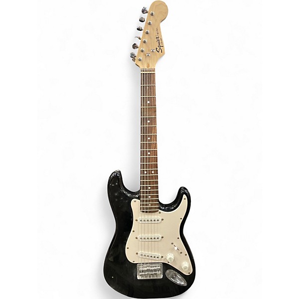 Used Squier Mini Affinity Stratocaster in Black, fair condition with noticeable cosmetic wear but fully functional. This 3/4-size electric guitar features a poplar body, maple neck, and Indian laurel fingerboard with 22 frets. Equipped with three single-coil pickups, standard volume/tone controls, and a five-way selector switch, it's perfect for beginners or players needing a compact instrument. Ideal for smaller hands or travel use, offering classic Strat tones in a smaller, affordable package.