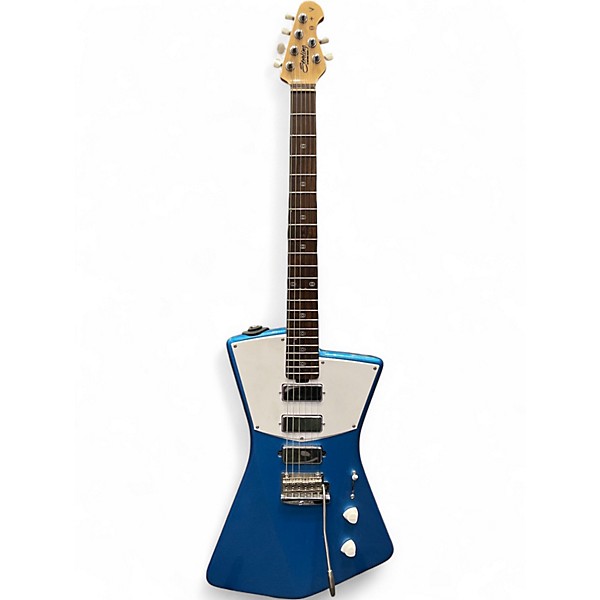 Used Sterling by Music Man St. Vincent solid body electric guitar in Blue, featuring a lightweight, ergonomic African mahogany body, three mini-humbucker pickups, and a maple neck with rosewood fingerboard. Known for its distinctive angular design and versatile tone, this guitar is in Good condition with minor cosmetic wear. A 25.5" scale length and 22 medium frets offer comfortable playability, making it a great choice for players seeking unique style and sound performance.