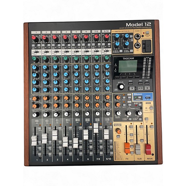 Used TASCAM Model 12 Unpowered Mixer in excellent condition, ideal for home studios, streaming, and rehearsal spaces. This compact 12-channel analog mixer features an integrated multitrack recorder and USB audio interface for flexible capture and playback. Includes mic/line inputs with EQ, onboard effects, and hands-on faders for fast, intuitive mixing. Rugged and portable, it delivers TASCAM’s reliable sound and workflow in a space-saving desktop format.