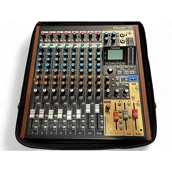 Used TASCAM Model 12 Unpowered Mixer in excellent condition—an all-in-one analog mixer, multitrack recorder, and USB audio interface built for studios and live streaming. Features 10 analog inputs with TASCAM mic preamps, 60 mm faders, onboard compression and EQ, effects, Bluetooth input, and 12-track recording/playback to SD card plus 12-in/10-out USB connectivity. A powerful, compact centerpiece for capturing clean, professional mixes anywhere.