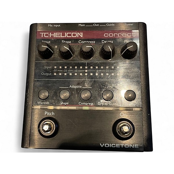 Used TC Helicon VoiceTone Correct Vocal Processor in fair condition. This compact vocal effects unit features adaptive EQ, compression, de-essing, and pitch correction, providing essential live vocal enhancements. With XLR input/output and phantom power support, it's ideal for singers seeking improved clarity and consistency on stage. Despite cosmetic wear, it functions properly and delivers the core vocal processing tools needed to elevate live performances. Perfect for budget-conscious performers looking to upgrade their sound.