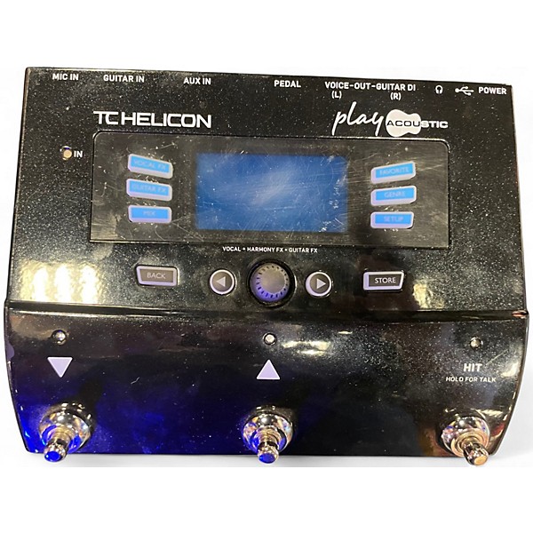 Used TC Helicon Play Acoustic effect processor in fair condition, offering studio-style vocal and guitar enhancement for live performance. Features include adaptive EQ, compression, reverb, delay, harmony and doubling effects, plus guitar anti-feedback and body resonance processing. XLR mic input with phantom power, 1/4" guitar input, stereo outputs, USB for updates, and onboard looping make it a versatile all-in-one tone tool for singer-songwriters seeking polished sound onstage.