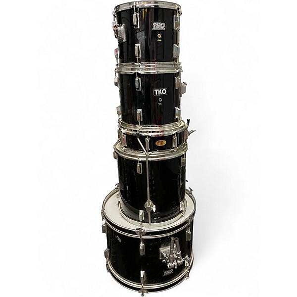 Used TKO 5-Piece Drum Set in black finish, in fair condition with visible wear and worn out heads. This complete kit includes a 22" bass drum, 12" and 13" rack toms, a 16" floor tom, and a 14" snare. Great for beginners or practice, for drummers seeking a low-cost setup to get started or for backup use in rehearsals or jam spaces.