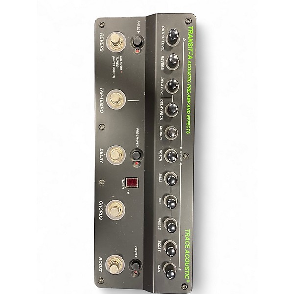 Used Trace Elliot TRANSIT-A Acoustic Guitar Preamp in good condition. This compact, pedalboard-friendly unit features a built-in tuner, 3-band EQ with variable notch filter, phase reversal, reverb, chorus, delay, and a convenient DI output for live or studio use. Powered by 9V DC, the TRANSIT-A delivers rich, professional sound shaping and feedback control. With intuitive controls and road-ready construction, this preamp is ideal for acoustic performers seeking premium tone and versatility.