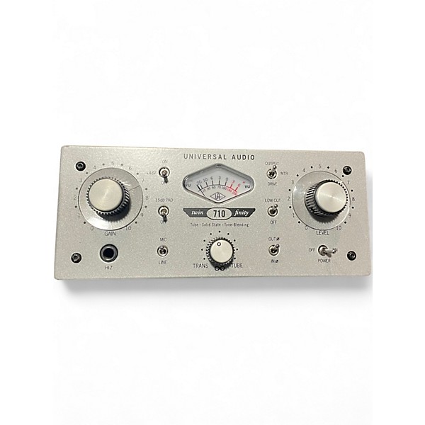 Used Universal Audio 710 Twin-Finity microphone preamp in good condition, delivering classic UA tone with flexible solid-state/tube blending. Features one channel with mic and Hi-Z instrument inputs, variable gain and output level, and 48V phantom power for condenser mics. The unique Blend control lets you dial in clean clarity or warm tube saturation, while a low-cut filter helps tame rumble. Great for vocals, guitars, bass, and more in any studio or live rig.