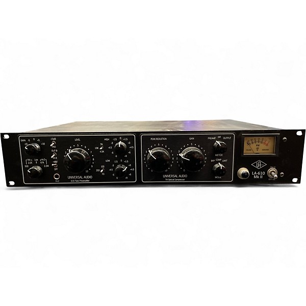 Used Universal Audio LA-610 MkII Channel Strip in great condition—classic 610 tube preamp warmth paired with smooth, vintage-style optical compression for vocals, bass, and instruments. Features a Class-A all-tube signal path, 48V phantom power, high-pass filter, EQ, and versatile gain staging, plus balanced XLR mic input and line I/O. Get rich harmonics, controlled dynamics, and studio-ready tone in one trusted rack unit.