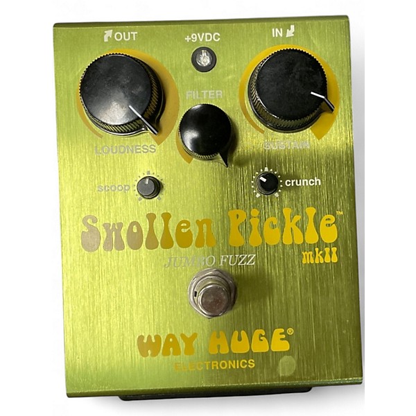 Experience massive fuzz with the Used 2013 Way Huge Electronics WHE401 Swollen Pickle Jumbo Fuzz Pedal, in Excellent condition. This pedal delivers thick, saturated distortion with heavy low end and smooth sustain. It features controls for Sustain, Filter, and Loudness plus internal Scoop and Crunch controls for tone shaping. True bypass switching preserves your signal path. Perfect for guitarists seeking that iconic, over-the-top fuzz sound with plenty of tweakability.