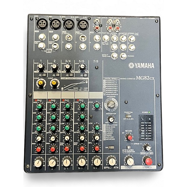 Used Yamaha MG82CX Unpowered Mixer in good condition, featuring 8 input channels with 2 mic/line combo inputs and integrated one-knob compression. This compact mixer offers built-in SPX digital effects, 3-band EQ per channel, and phantom power for condenser mics. Ideal for small live sound setups or home studios, the MG82CX provides clean, reliable audio mixing with a rugged build and intuitive controls, ensuring flexible performance in a portable package.