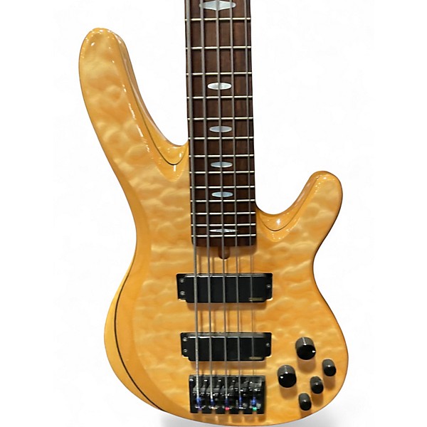 Used Yamaha TRB1005 Blonde Electric Bass Guitar in great condition, featuring a solid alder body with a flamed maple top, a 5-piece maple/mahogany neck, and a rosewood fingerboard. This 5-string bass offers a 35" scale length and active electronics with 3-band EQ for versatile tone shaping. Dual humbucking pickups provide deep, punchy lows and clear highs, making it ideal for a range of playing styles. A reliable choice for stage or studio performance.