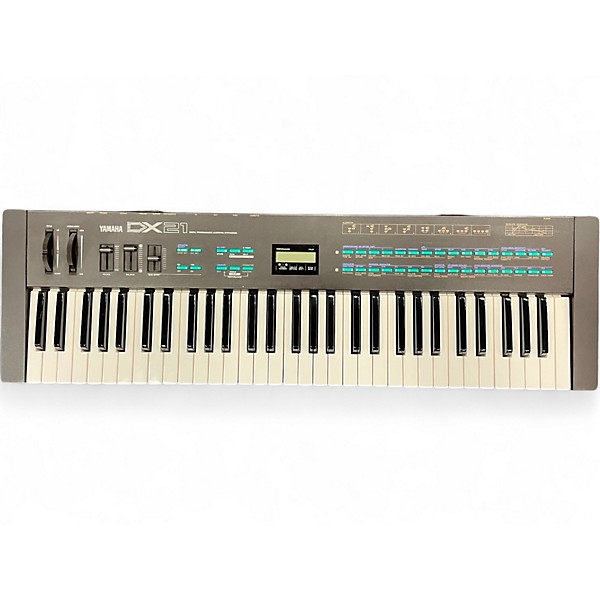 YAMAHA DX21 61-key polyphonic digital FM algorithm synthesizer. The DX21 is like the "baby brother" of the original DX7. It is 4-operator FM unlike the more advanced 6-operator architecture of the DX7, but has some features that the DX7 does not. One of these is both Dual and Single modes of play, which allows the player to layer two different sounds. Another is its built in Chorus effect, which the player can select ON or OFF, that gives whatever voice it is applied to a wider, fatter sound. The DX21 also allows one to split the keyboard so as to play one voice with the left hand and another with the right. The DX21 provides a full five-octave keyboard but in a much more compact form factor. That being said, it is still very solidly built with a steel (not plastic) chassis, so it's not a featherweight, but is considerably lighter than a DX7 or its 4-op sibling, the DX9. One could think of it as a more advanced DX9 in a much smaller package.
