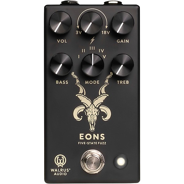 With five selectable clipping modes and a variable voltage control that reshapes the circuit from gated sputter to wide-open fuzz, the Walrus Audio Eons five-state fuzz pedal delivers a broad range of thick, aggressive fuzz tones with precise control over feel and response. Reimagined for the Minimal Series with a blacked-out aesthetic, this fuzz stompbox retains its full tonal range, from vintage-inspired saturation to chaotic, high-gain textures. Designed to push amps hard while maintaining articulation, the Eons gives players a flexible platform for shaping everything from classic fuzz tones to more experimental, modern sounds.