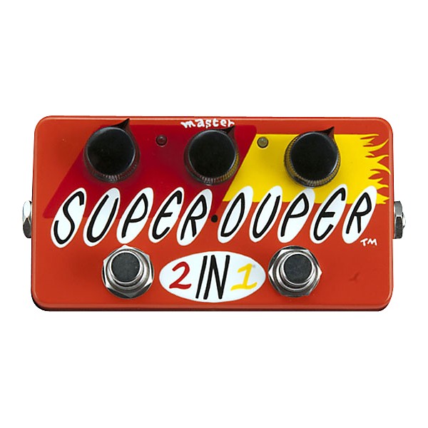 The Super-Duper 2-In-1 guitar pedal from ZVex is a dangerously loud pedal that combines two Super Hard-On pedals in one small box, with two switches, and LED indicators. Its Master volume control lets you use it as an overdrive/distortion with any output volume.